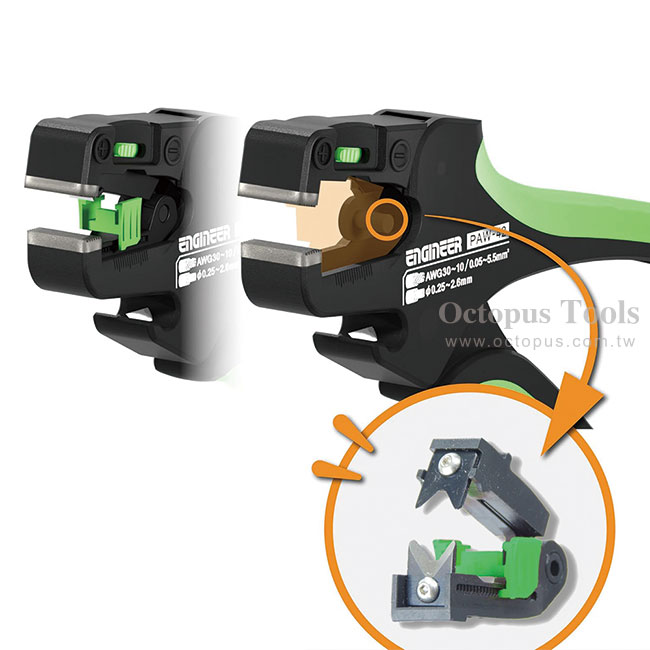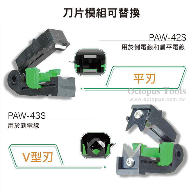 ◆ 刀片模組可替換,PAW-43附V刃刀頭(PAW-43S),適合用於剝圓線或需要精度較高之剝線作業。
