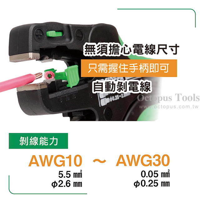 剝線能力(絞線):0.05 ~ 5.5mm2(AWG30 ~ 10)