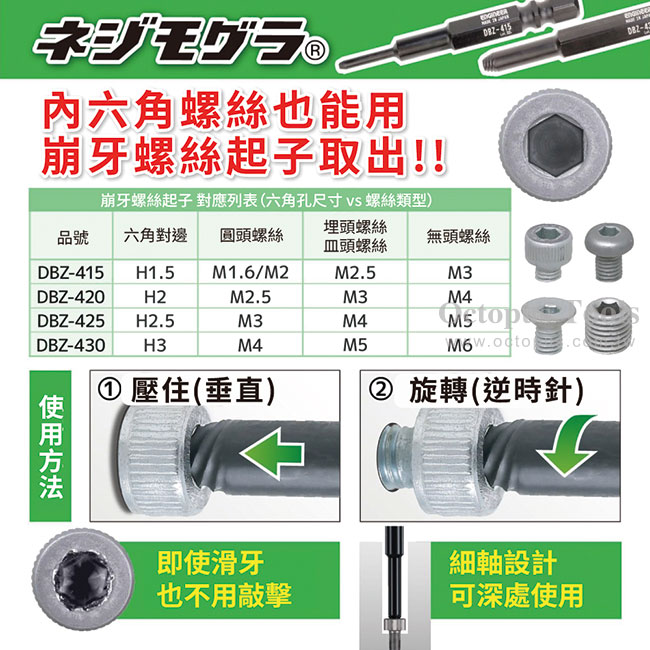 ◆ 前端搭配50mm以上的DBZ起子頭使用,可輕易轉起沉頭生鏽崩牙螺絲。