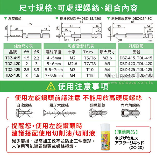 注意事項:請勿將產品使用於特殊熱處理、超硬的螺絲上,或是使用於有黏合劑的螺絲上。